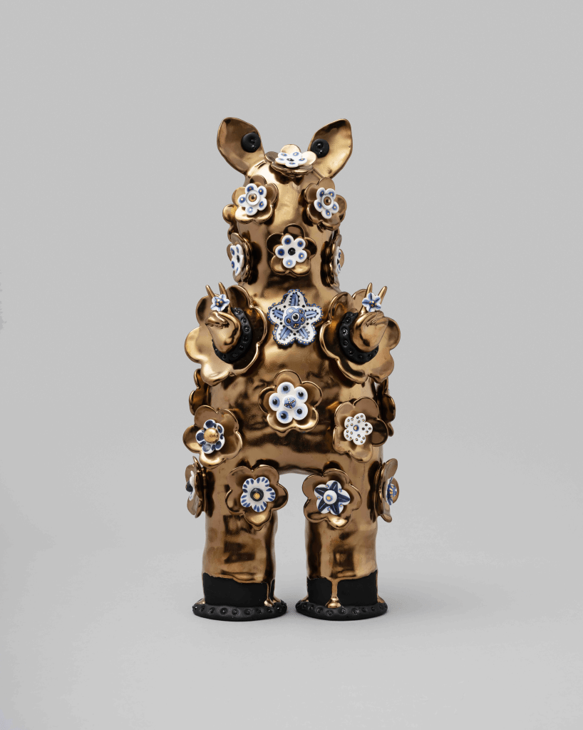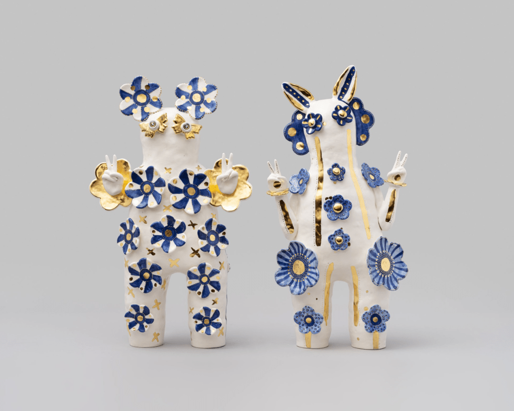 His playful and ornate ceramic works explore themes of migration, spirituality and human connection. Vipoo’s new works for the fair are from his ongoing blossom series which incorporates flowers as a metaphor for friendship: “Just as flowers brighten our surroundings and bring beauty to our lives, friendships blossom and grow, adding colour and vibrancy to our experiences. They remind us that, like a well-tended garden, friendships require care and attention, but the rewards are boundless.” The character’s fingers form ‘V’ signs as ‘a universal gesture of peace, friendship and happiness,’ Srivilasa explains “Despite the challenges we face, we can find solace and strength in our connections with others. By including this symbol, I want to convey that everything is okay, and that together, we can create a peaceful and joyful world.”