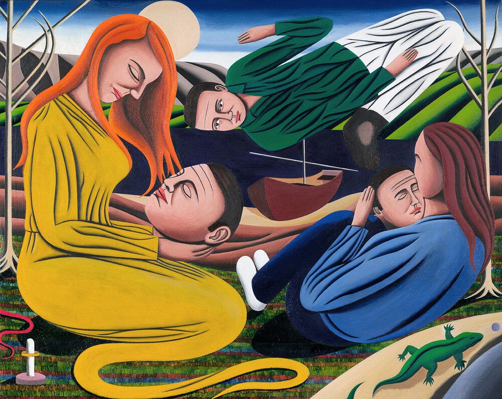 In his latest exhibition of new paintings from this year he draws on medieval styles of depiction, artists of the Trecento such as Giotto, Francis Bacon and Colin McCahon. His cartoon-like approach and the Christian imagery creates a unique view of the social. psychological, and spiritual dilemmas of society.
