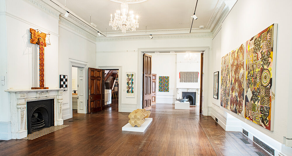 Her works use these images in paintings and prints combining images of domestic objects, along with traditional patterns and geometric designs, intricately layering historical and contemporary references. In the case of the large painting “Markers of Community” where one painting is overlaid with another the drama of contemporary patterns interwoven with those of the traditional.