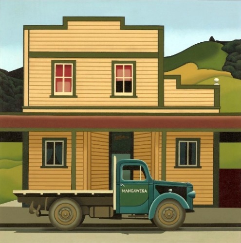 Her work up till 1982 when she moved to Kiribati is quite distinctive from the latter work she would produce. Her work of the 1970’s includes images of building and landscapes of the places she encountered – Bottle Creek, Porirua, Mt Eden, Dunedin and Harbour Cone. Some of these paintings recall McCahons line about “a landscapes with too few lovers” but they also hint at Rita Angus’s Cass.