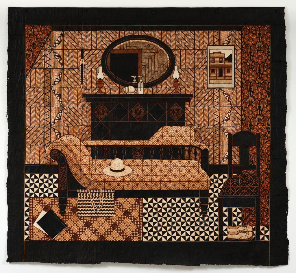 The works range across fifty years, from her early colourful prints of herself, family, friends and her local environment to the large collaborative works she has undertaken with artists from across the Pacific, including Japanese artists Keiko Iimura and Taeko Ogawa and her large-scale tapa works with Tongan artists, Ruha and Ebonie Fifita, and Fijian artist, Tamari Cabeikanacea.
