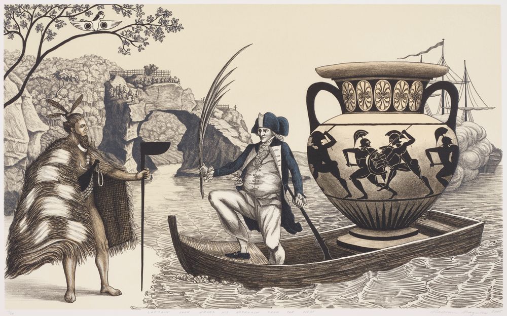 The artist has depicted scenes from early New Zealand’s history including works from “The Odyssey of Captain Cook” series which features an Attic vase with images of sailors disembarking from a Greek trireme, Joseph Banks bartering with a Māori for a lobster (an image based on the drawing by Tupaia) and the death of Captain Cook shown in the style of a Grecian frieze. Another image features Cook landing on a beach holding a palm frond in one hand and a musket in the other. In the boat with him is a large Greek vase depicting soldiers fighting and behind that, a partial view of the Endeavour firing its cannons.