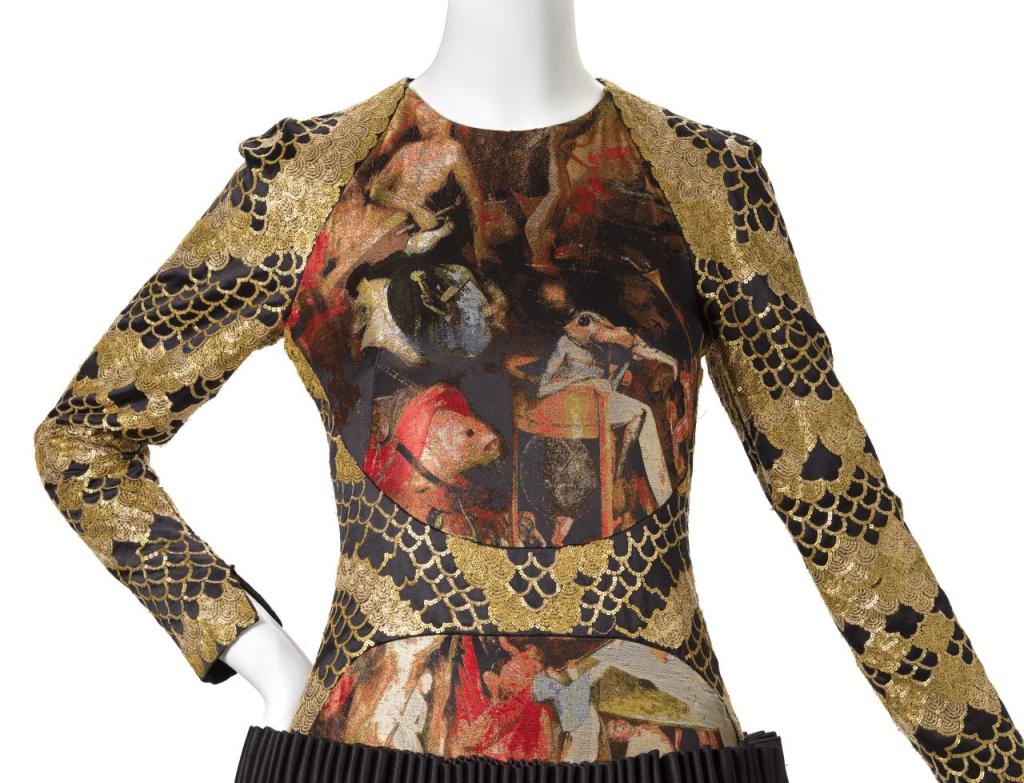 His posthumous “Angels and Demons” collection of 2010–11, referenced Christian iconography from the Byzantine Empire as well as the northern and Italian Renaissance. With these works he created a poetic, medieval beauty that dealt with religious iconography using fabric that translated digital photographs of paintings such as Hieronymus Bosch’s images of demons.
