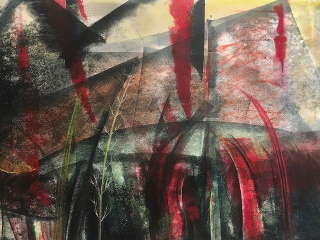Printmaking can be a seductive process… Sometimes (with eyes closed) I draw into dark ink applied to the “plate” surface, prior to printing. The resulting unexpected discoveries can then be taken further to reveal and inspire – often suggesting a sudden undoing of any preconceived idea.1