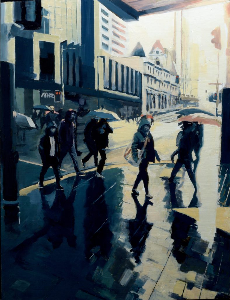 Paintings such as “Britomart crossing on a rainy day” ($2200) refer back to the work of Pierre Bonnard having many of the features of the Post Impressionist period such as capturing a scene with seemingly, quickly applied brush strokes, distorting forms for expressive effect, the use of unnatural colour and an emphasis on strong light.