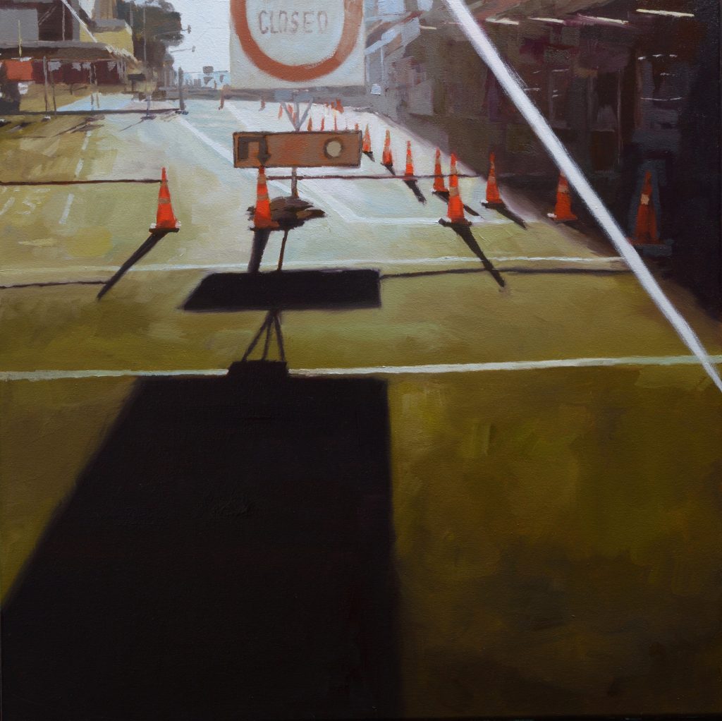 In some of the paintings the artists approach seems casual as in “Victoria St West” ($2150) where the emphasis is on the road sign and its shadow which dominates the painting. This emphasis on the common everyday fragments of life mirrors much of the literature of the French New Wave writing of Alain Robbe-Grillet.