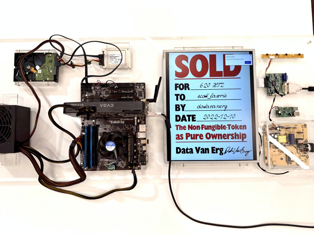 Another work in the show Ownership Machine ($1750) has a screen featuring the image of a SOLD work in a homage to Billy Apple’s SOLD works. The work is the receipt of transaction and is owned by the holder of the non-fungible token ‘Obsession of Pure Ownership’ on the Tezos Blockchain.
