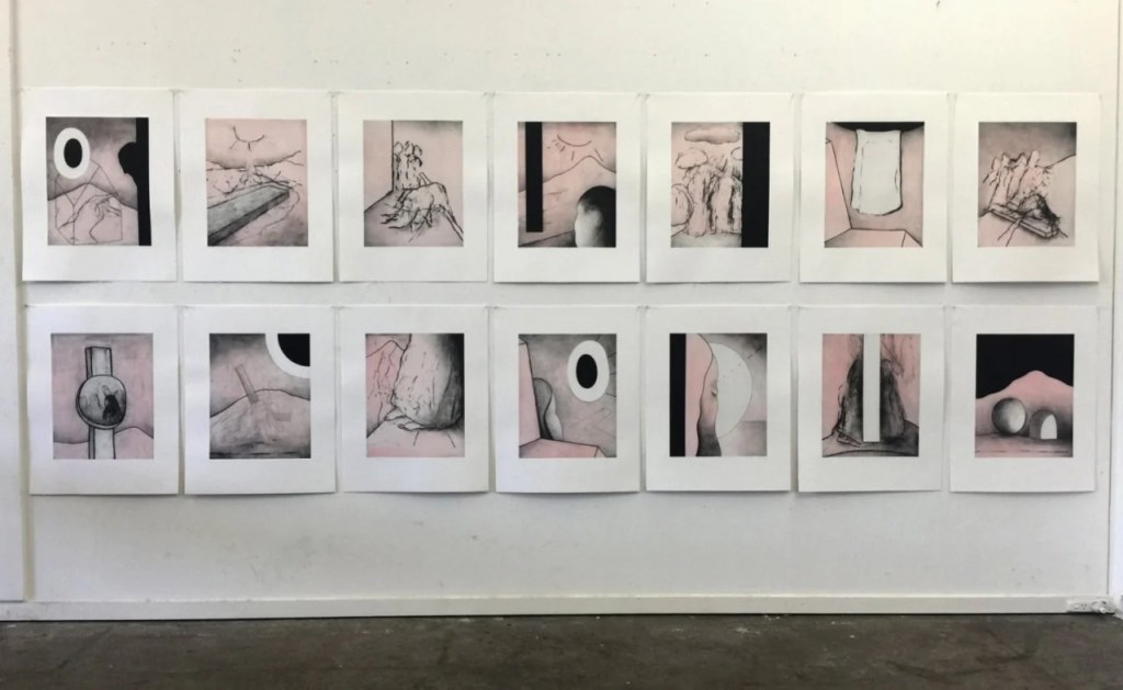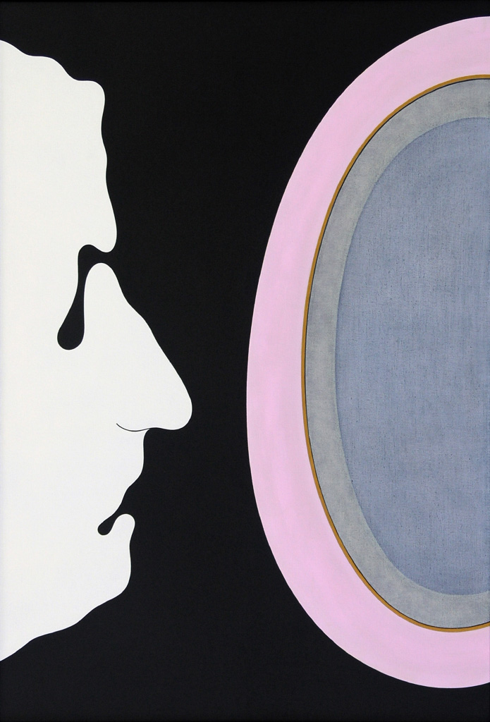 “The Swamp” series feature abstract shapes which resemble wispy swamp plant forms or creatures which seem to be morphing into humanoid shapes. existing in some sort of dreamworld. This sense of dreamworld is also present in another series titled “The Grotesquerie”, which have strong psychological aspects, examining his fraught family connections. Here Dali-like stylised images of his father and mother are observed by the “O” of the artist.