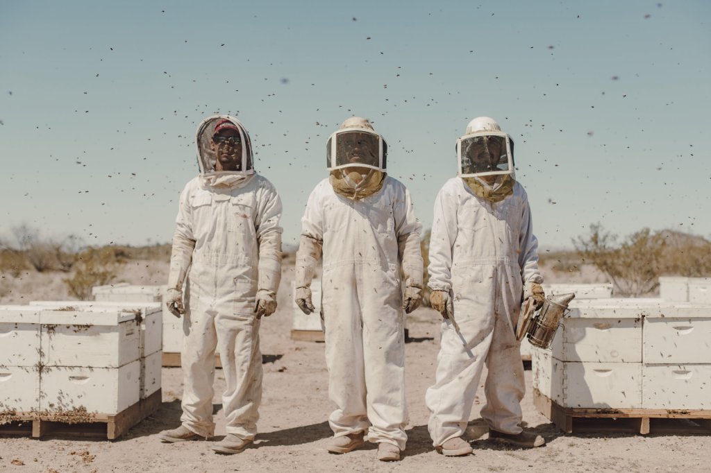 There is also a surreal image by Jonas Kakop of three white clad beekeepers in the Arizona desert who are providing water to bee hives as the Colorado River dries up.