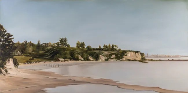 Several of the works make reference to Auckland’s history so “Campbells Point at Judges Bay” ($7500) includes `Kilbryd’, the large Italianate home of Sir John Logan Campbell. In this painting the artist has shaped much of the view making the foreshore beach a series of flat planes while the cliffs below the house have been sculpted with gentle curves of lawn.