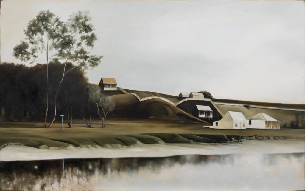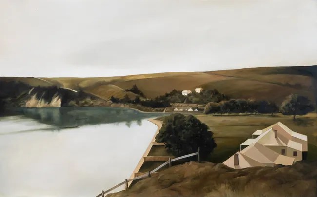 With “Settlement, St Georges Bay 1867” ($3800) the houses seem like surreal addition, the boxlike shapes placed in the carefully formed landscape consisting of folded landforms, where the fence lines are made from abstract curves.