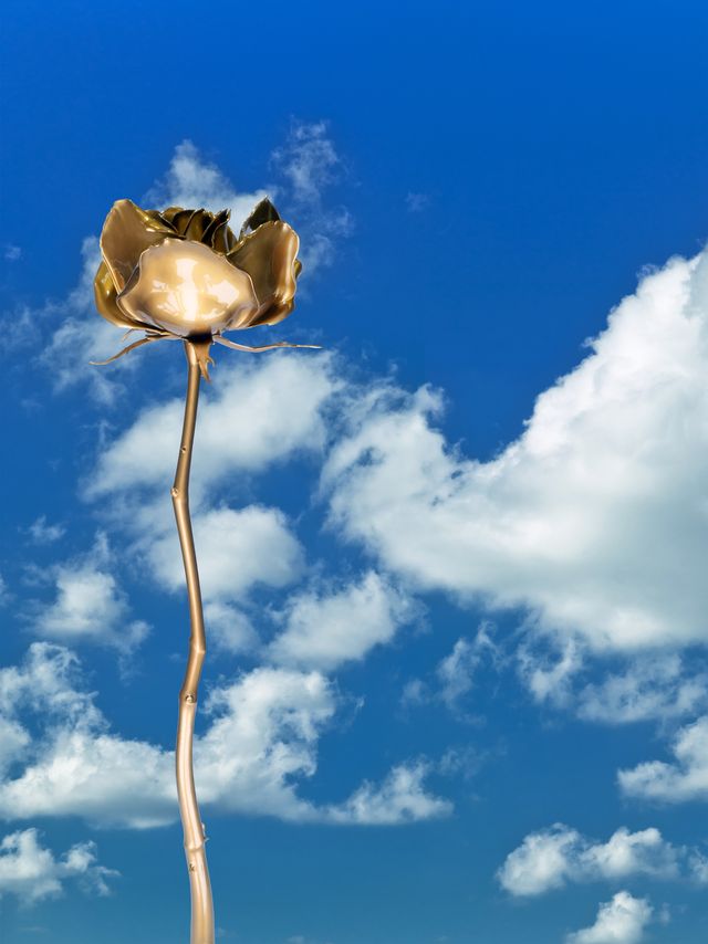 Hye Rim Lee’s artistic practice navigates the fluid threshold between the real and the virtual, translating digital imagination into tangible form. Gold Rose emerges from her iconic 3D animation series White Rose, where virtual fantasies are reborn through material transformation. In this sculptural work, Lee transforms glass — a medium rooted in her digital world — to explore its dual nature: hard yet fragile, liquid yet solid, transparent yet opaque, in her cast Gold Rose.