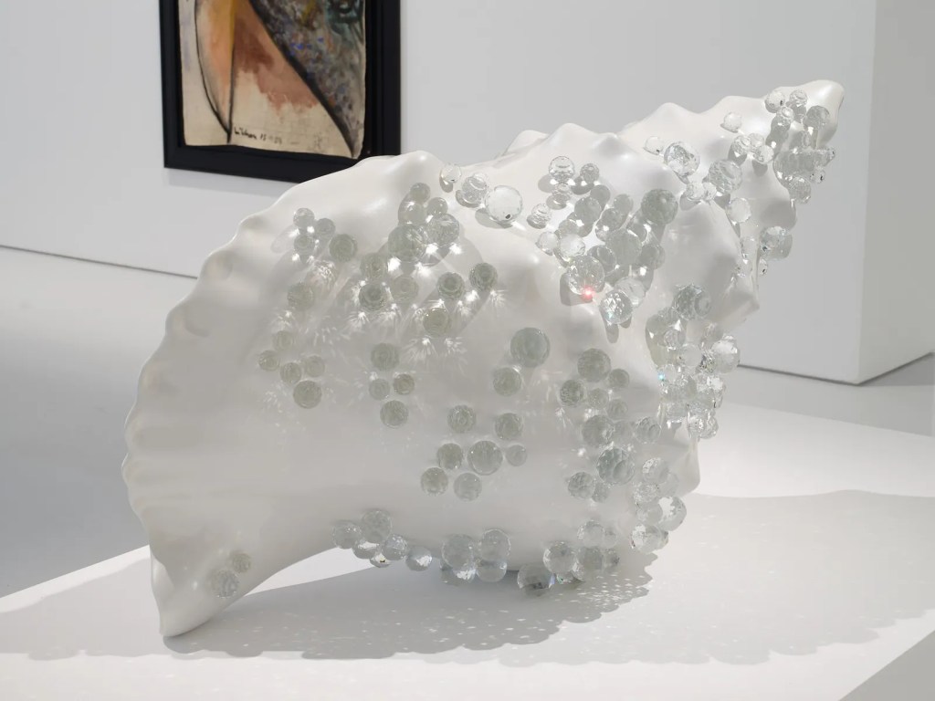 Reuben Paterson’s Koro is a sculptural work from 2023. Crafted from cast aluminium, painted with automotive lacquer, and encrusted with glass crystals, it showcases Paterson’s ability to create works across a diverse range of media.