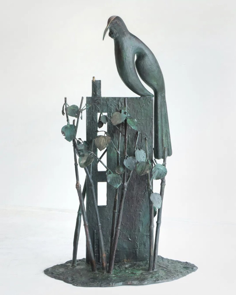 Paul Dibble’s Healing a Busy World acknowledges the return of native birds into the built environments of our cities. His flattened volume, references to building outlines and modern architecture interspersed by rectangular windows filled with light and hope. We also see for the first time a new rich green patina and the emblematic, symbolic sticks of healing kawakawa reclaiming the city.