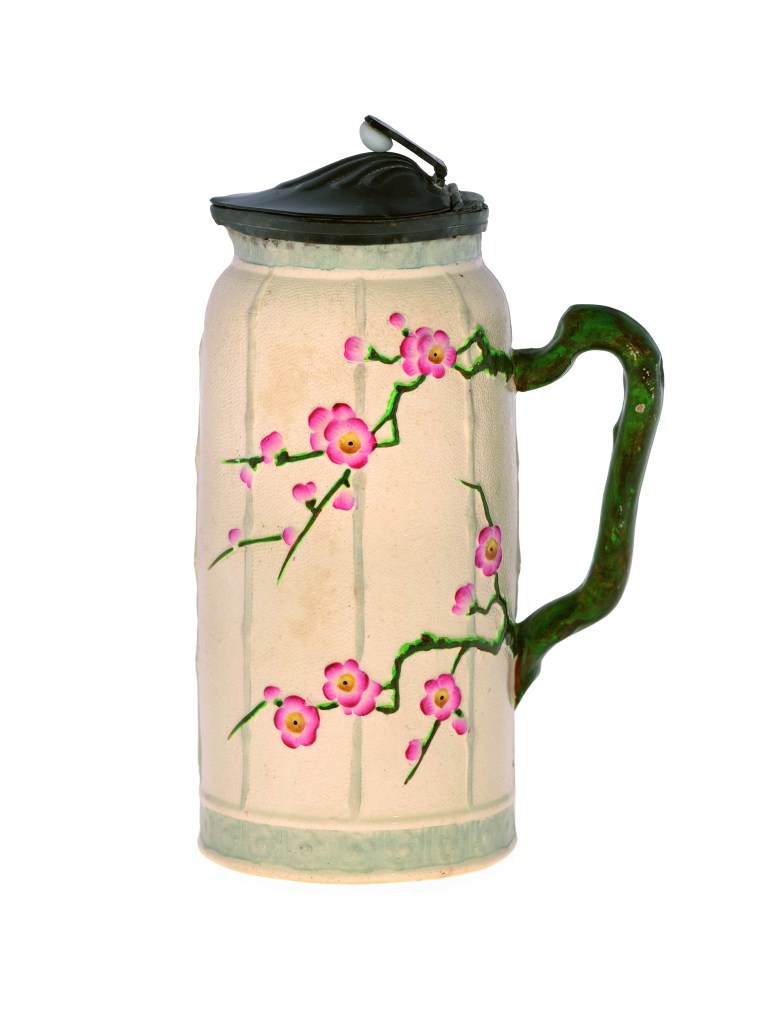 This Japanese-inspired jug with a cherry blossom pattern and bamboo handle was bought in Blenheim. Its manufacturer, Pinder, Bourne & Co of Stoke-on-Trent, was taken over by Doulton in 1882. Jug, 1877. Manufacturer: Pinder, Bourne & Co, England. Stoneware, pewter, 210 x 145 x 145mm, CG001804.