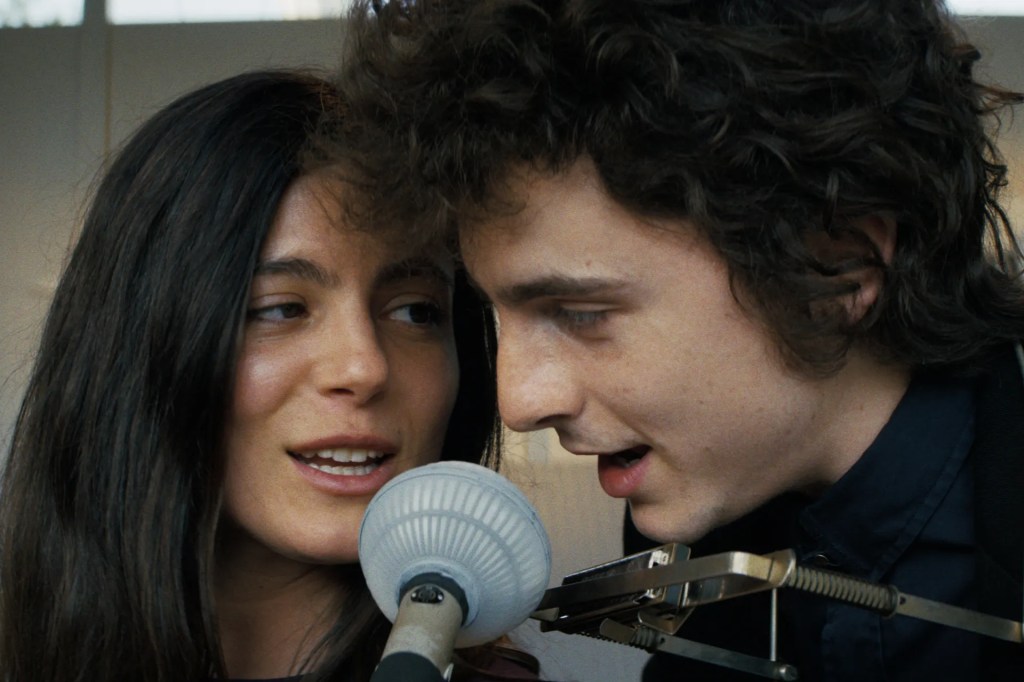 Monica Barbaro (Joan Baez) and Timothée Chalamet Bob Dylan