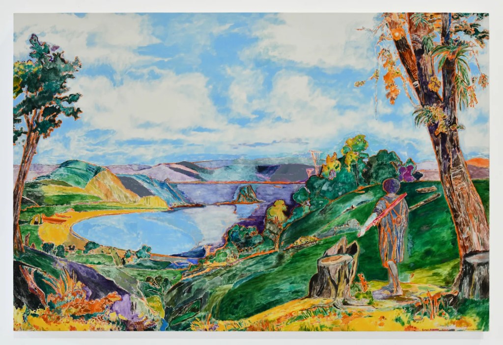With this new series of works he has revisited many of his previous subjects including depictions of Karamea, Great Barrier Island, Chathams, Great Mercury Island and Matauiri. While these are mainly landscape there are a few which also feature other element in the landscape which add a visual drama as in “Akiaki – Chathams” ($30,000) where he has included windswept trees and grazing sheep.